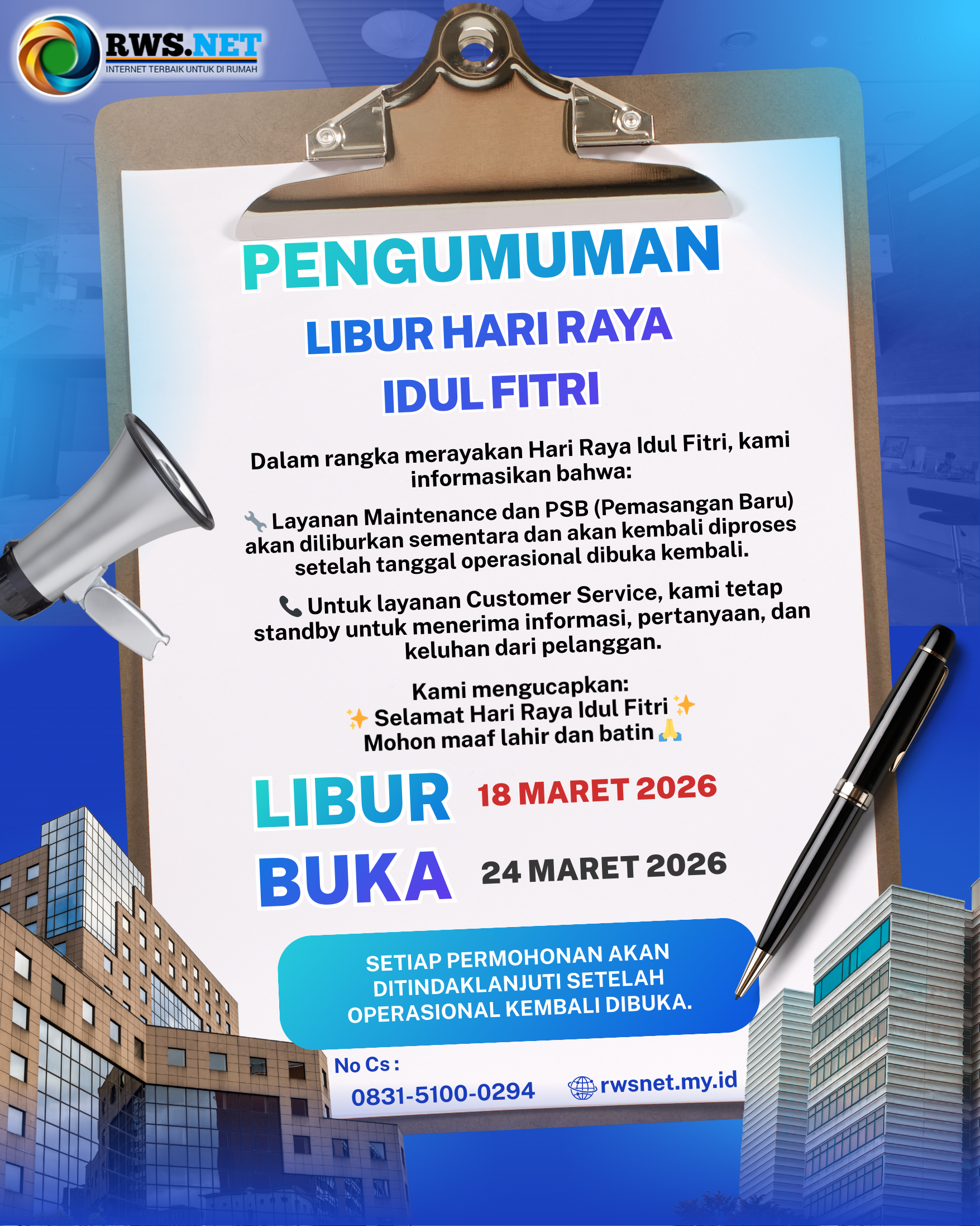 Dalam rangka menyambut dan merayakan Hari Raya Idul Fitri 1447 H, kami dari RWSNET menginformasikan kepada seluruh pelanggan bahwa akan ada penyesuaian operasional layanan